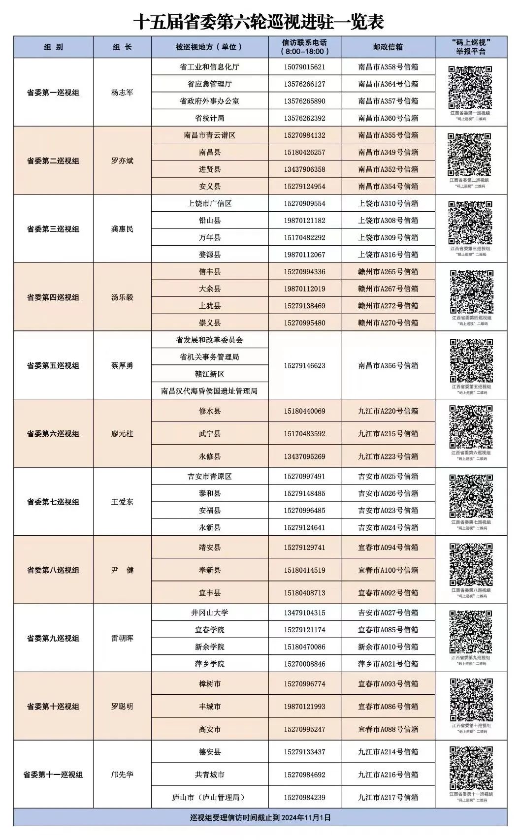 十五届江西省委第六轮巡视完成进驻 按照省委统一部署,截至9月5日,十五届省委第六轮巡视完成进驻工作,省委11个巡视组开始对40个地方和单位党组织开展常规巡视。 各被巡视党组织分别召开巡视进驻动员会。各巡视组组长作动员讲话,对深入学习贯彻习近平新时代中国特色社会主义思想,认真贯彻落实党的二十届三中全会和省委十五届六次全会精神,高质量完成本轮巡视任务提出要求。 各巡视组组长指出,巡视是推进党的自我革命、全面从严治党的战略性制度安排,是上级党组织对下级党组织履行党的领导职能责任的政治监督。省委巡视组将坚持以习近平新时代中国特色社会主义思想为指导,坚守政治巡视定位,全面贯彻巡视工作方针,紧盯权力和责任,紧盯群众反映强烈的问题,加强对“一把手”的监督,推动党中央、省委决策部署落地落实。 各巡视组组长强调,要准确把握被巡视党组织职责使命,落实政治巡视要求,聚焦学习贯彻习近平新时代中国特色社会主义思想、贯彻落实党的二十届三中全会精神和习近平总书记考察江西重要讲话精神、加强党的政治建设、落实全面从严治党主体责任和监督责任、作风建设、领导班子和干部人才队伍建设等情况,深入查找政治偏差,推动深化改革、堵塞漏洞、源头治理。要深入了解巡视整改和成果运用情况,重点查找敷衍整改、虚假整改等问题,释放从严整改鲜明信号。 各被巡视党组织主要负责人表示,将深入学习贯彻习近平总书记关于巡视工作的重要论述和党中央、省委部署要求,切实提高政治站位,自觉接受监督,积极配合巡视,以推动各项事业高质量发展的实际行动坚定拥护“两个确立”、坚决做到“两个维护”。 各巡视组将在被巡视地方和单位工作2个月,期间设立专门联系电话、邮政信箱,开通省委“码上巡视”举报平台,主要受理反映被巡视党组织领导班子及其成员、下一级党组织主要负责人和重要岗位领导干部问题的来信来电来访,重点是关于违反政治纪律、组织纪律、廉洁纪律、群众纪律、工作纪律和生活纪律等方面的举报和反映。本轮巡视受理信访时间截止到2024年11月1日。 |